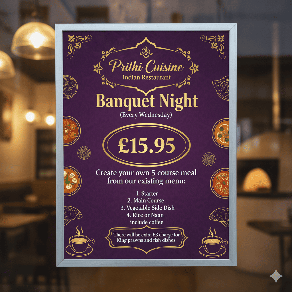 We welcome you at Prithi. We strive to recreate the distinct and authentic home-cooked flavours of Bangladeshi and sub-continent Indian food. It is truly famous for: a taste born out of passion forged upon open flames and in clay ovens, the aromatic spices of Kashmir and origins of balti cooking, just like ours. Lovingly prepared with the finest ingredients specially selected, bursting with freshness and taste. The rustic flavours of Bangladesh are yours to discover, savour and enjoy, every day and for every occasion. With reputable head chef and courteous staff at your service, Prithi will serve you in an intimate and relaxed atmosphere. With a host of unique and mouthwatering dishes, made from exotic and flavour some ingredients, it will tantalise your tastebuds. Creating quality Indian food and luxurious culinary dishes, the whole experience of contemporary dining is simply divine…indulge your appetite.